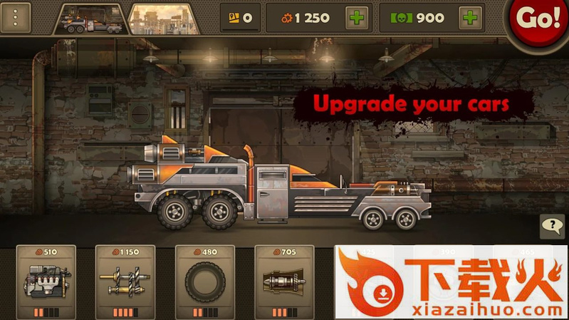 游戏的细节做的很棒,在升级界面中,当你升级引擎或变速箱时,在战车的前端会有略微的下沉,在战车行进的过程中,重量分配不均就会容易后翻或前倾影响车速,这个时候就需要在车库里购买升级重新配重,这对战车的稳定性十分重要。在升级轮胎的前后对比中,上坡时的爬力会明显的体现出来。小编认为武器配置设计的不是很好,武器是自动发射的,一枪一个,打完就废了,而且只能够对僵尸进行射击,如果把它改为玩家手动触发能够升级为更强大的火炮就更爽了,而且对障碍物和建筑物业能够进行攻击的话,那画面感就更是上了另一个境界了。