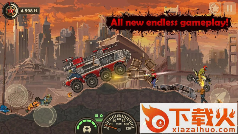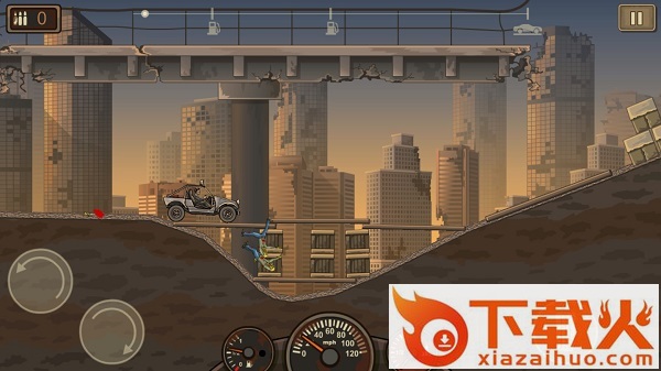在战车行进的过程中,路上会充满了障碍物和僵尸,到后面的关卡会会出现大型的僵尸和更为坚硬的路障出现,这些都是为了阻止战车的前行,尽可能躲开或飞跃这些障碍物是到达更远距离的不二选择。在跑过几次后会对关卡的地形有一个熟悉,寻找一个合适使用推进器的路段是取得胜利的重要手段,这能够让你战车飞起来,小伙子,多攒点钱,让你的车飞起来吧。