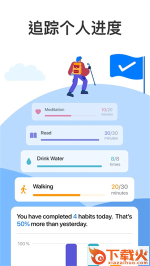 - 时刻追踪你的个人进度,查看每个计划的当前进度,努力完成设置的目标;