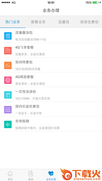 业务办理:4G套餐、上网套餐、流量叠加包、语音优惠包,一键办理,省时省力。