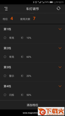 自定义车灯档位的亮灯模式,可选择:常亮、闪烁、渐变、SOS,可以添加和删除车灯档位,根据骑行需求进行自定义控制