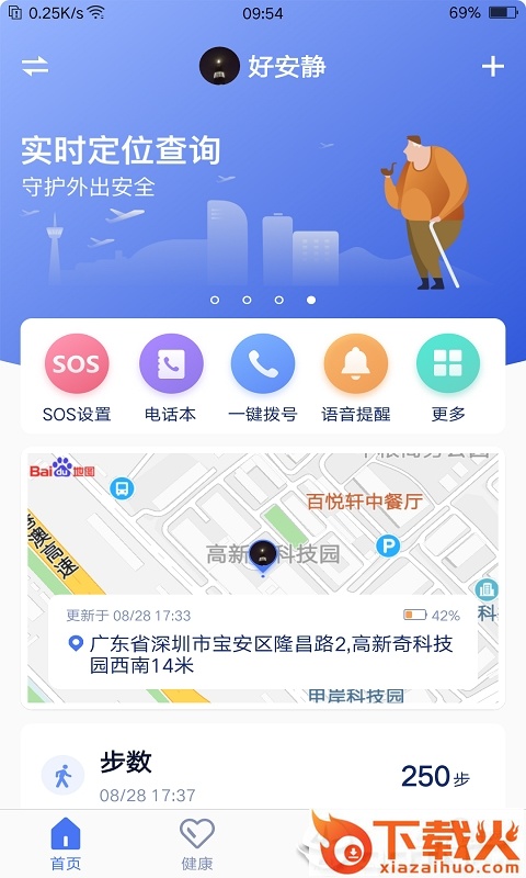 颐相伴app是颐相伴硬件手机配套应用,软件可以帮助精准定位,可以查看计步、心率、血压等,还可以管理老人设备通讯录,是一款智慧养老助手。