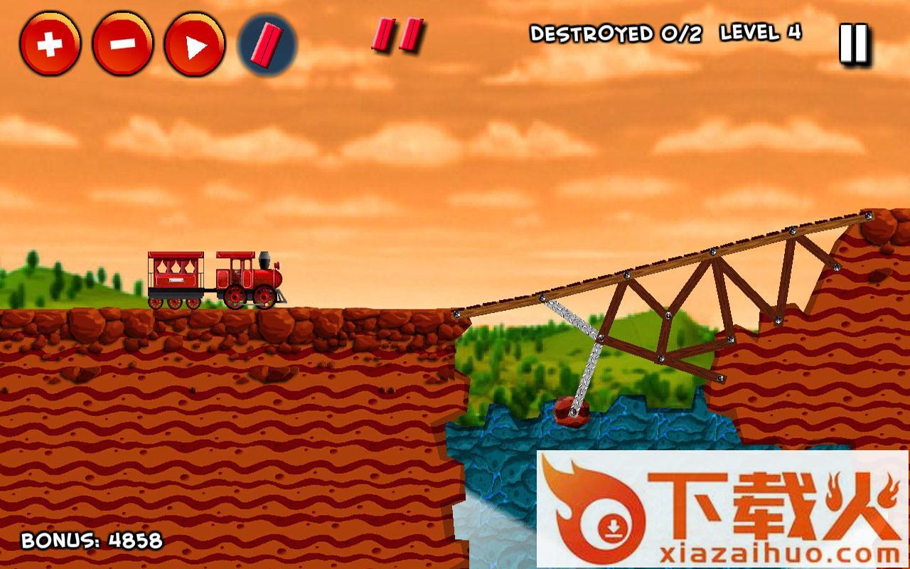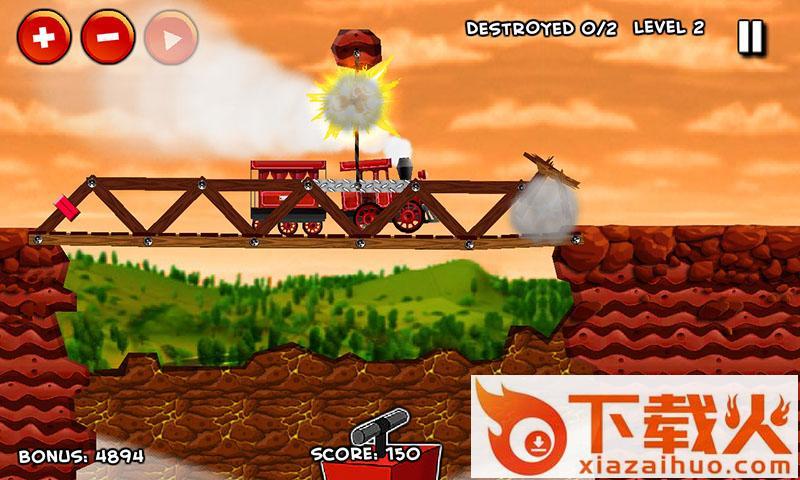 爆破火车是一款以炸烂火车为目的的发泄类游戏。在这款游戏中,你需要在桥梁下面放置炸药,将路过桥梁的火车炸掉,如果能让火车掉落悬崖就算过关哦。觉得这款游戏还不错的小伙伴快来下载吧!