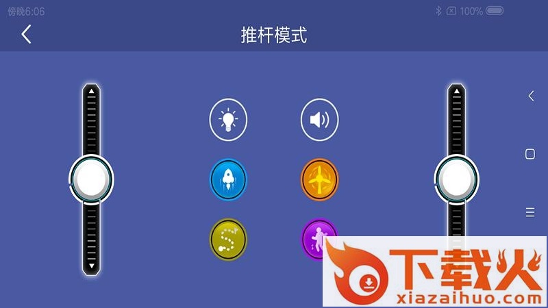 该APP可以通过蓝牙控制机器人,不仅可以通过左右推杆控制左右轮子的速度,也可以通过摇杆控制机器人的行走方向,还可以开关灯,