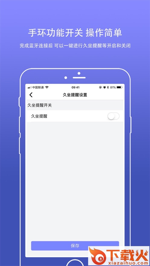 手环检测用户静坐时间,给予震动提醒。用户可以根据自身所需,通过APP开启和关闭此功能