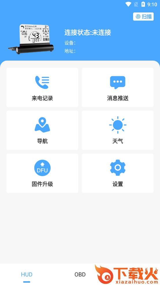 APP可以实现天气、短信、来电、微信等第三方应用通知和手机导航等数据传输到HUD设备上进行显示,同时APP可以为HUD设备进行OTA升级。
