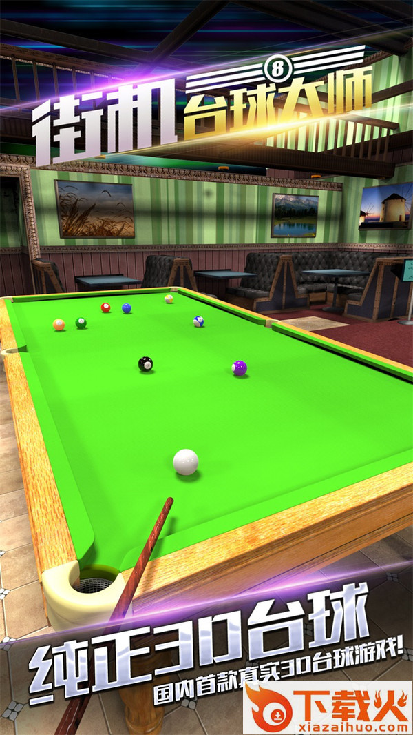 1、 挑战网络上来自全世界的朋友在3D台球世界对战,从草根轻松成长为台球明星。