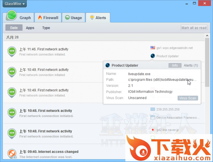 GlassWire(免费网络防火墙 是一款适合普通用户使用的网络防火墙工具,可提供网路即时流量、网路通讯监控、中断应用程式连线、整体网路或单一应用程式的流量统计与即时连线警示…等功能。以图形的方式显示...