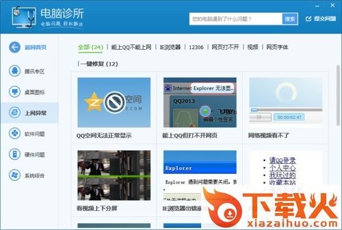 电脑诊所解决用户上网过程中遇到的异常情况,包括网页异常(如:能上QQ但打不开网页)、浏览器异常(如:ie浏览器出错崩溃)、官方网站异常(如:12306火车票网站证书错误)、链接异常(如:网站内的链接打不开)、字体异常(如:网页变成白底蓝字)等等。