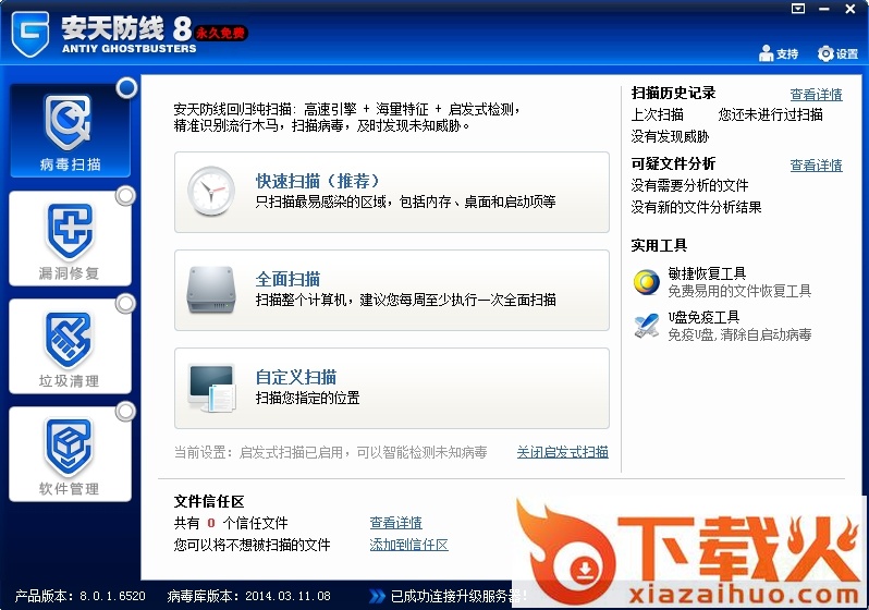 安天防线2008由安天出品,集查杀、清除、防御、管理于一体,拥有超大病毒库,能够查杀17万种、200万个病毒、黑客、后门、木马、蠕虫、流氓软件、盗号程序等有害程序。