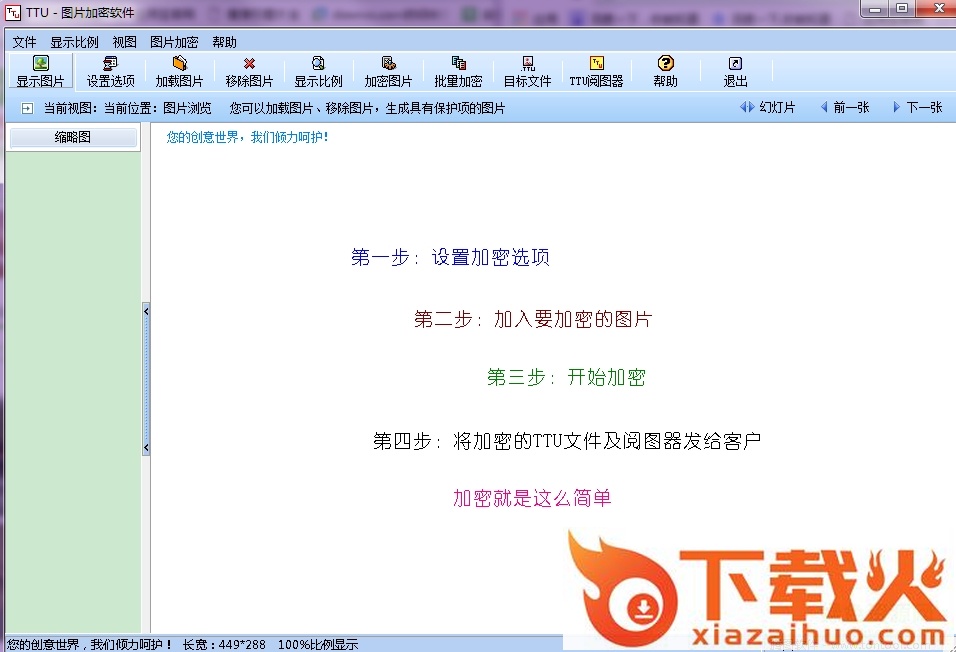 TTU图片加密软件是一款给图片进行加密处理的软件,它能够按照自己的意愿对图片设置加密保护,防止图片泄露,或者给不想看到的人看到,软件体积也是十分的小,非常适合下载了直接使用,是一款非常不错的图片加密工具,喜欢就来绿色资源网下载吧!
