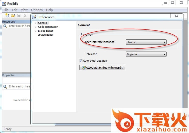 在本站下载完解压,运行ResEdit.exe在主界面菜单栏点击option(选项)-点击(Parameter)参数--(Language)语言---选择Chinese(中文):如下图