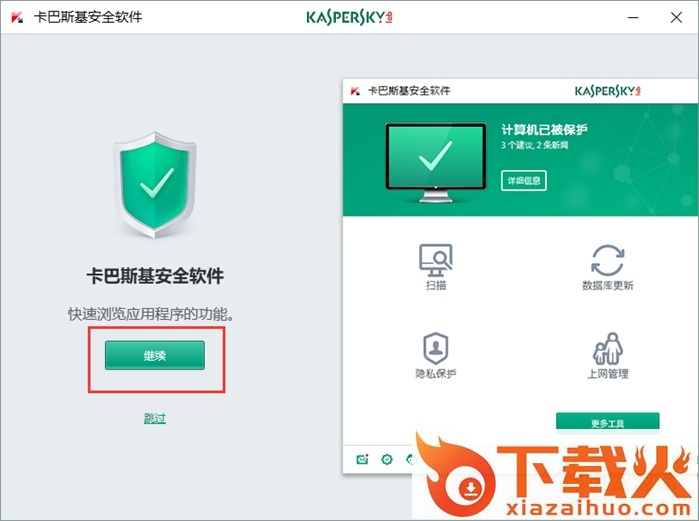 步骤 11. 点击继续查看卡巴斯基安全软件2018的功能。这个步骤是可选的,如果您愿意的话可以跳过它。安装并启动卡巴斯基安全软件2018之后,请使用商业授权激活它。