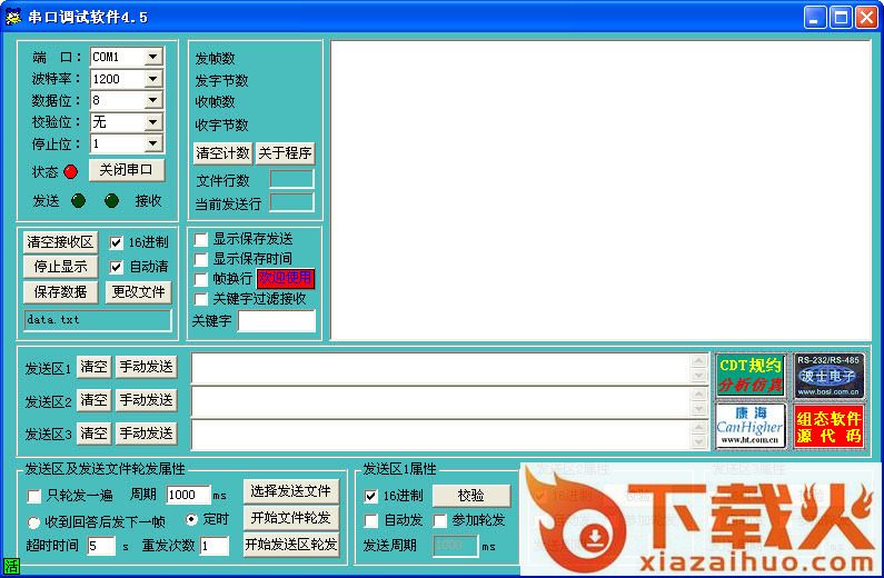 自动识别串口,能设置校验、数据位和停止位,能以ASCII码或十六进制接收或发送任何数据或字符,可以任意设定自动发送周期,并能将接收数据保存成文本文件,能发送任意大小的文本文件。