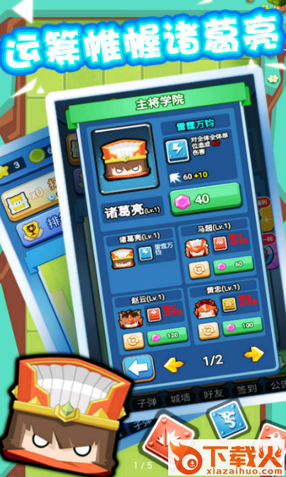 英雄培养系统:玩家需要玩到对应的等级关卡才会开启不同类型的英雄,既有智勇双全的诸葛亮,又有骁勇善战的战神吕布等待着你来开启。