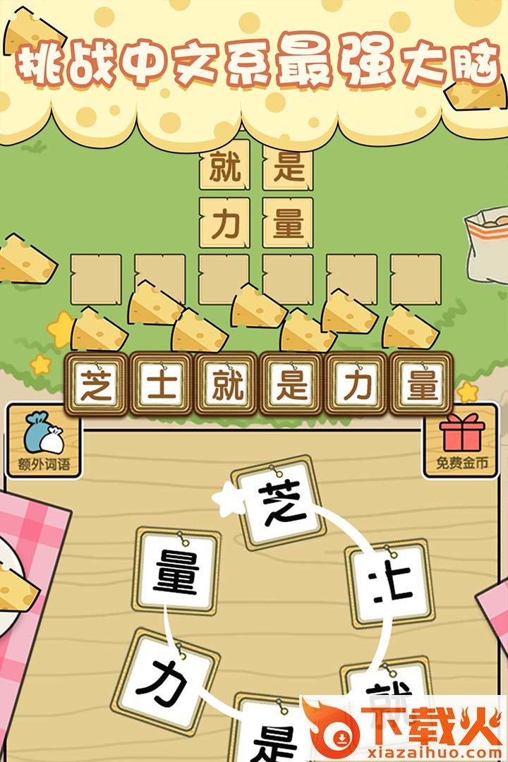 这是一个结合猜成语和线条连连看的益智趣味文字游戏,是中华民族传统的文字游戏新玩法。中文有着悠久的历史,也有广泛的社会基础,组词造句能体现我国文字、文化、文明的精彩。文字游戏规则多样化,老少咸宜独特有趣,而这款《芝士就是力量》在众多文字冒险游戏中脱颖而出,轻松上手,每关又包含难度,韵味十足,带给你无限惊喜与快乐!