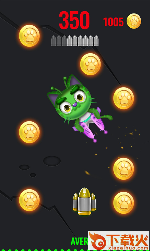 轻点屏幕画面让你的猫咪借由射击枪支的后座力往上飞行吧!记得抓准射击的时机和角度,这个将决定你的猫咪飞行时的方向,飞行之路会有金币,千万别放过它们!金币将可以解锁更多新种类的背景和武器!同时要记得补充子弹喔~跟朋友比比看谁的猫咪才是真正的神枪手!