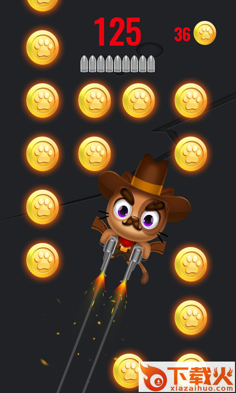 飞天小酷猫是一个休闲射击类型的游戏,扮演一只很酷的小猫,通过向下射击的反冲力来不断上升,一路上收集金币,不同的射击方向和强度来决定可以飞多远,金币不用吝啬,合理购买皮肤和武器吧。