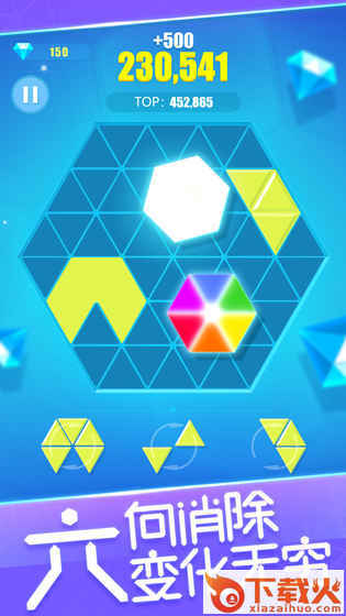 一次消除的正六边形越多得分越高!当指定区域内无法放置图形组合时则游戏结束,结束时的积分越高则排名越高,同时获得的钻石奖励也越多呦!