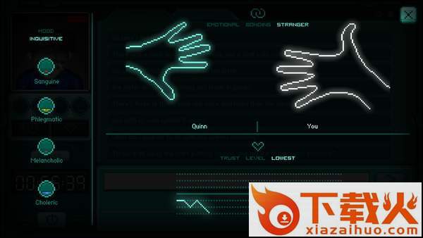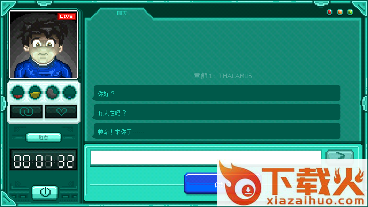 主角无缘无故在一个上锁的密室中醒来的时候,他是懵比的,不知道自己为什么会处在一个这样危险的状态之下,没有多余的思考空间,他能逃离的方式只有靠你了,靠你和他的对话,你和这个男孩通过电脑聊天的方式一步一步帮助引导他逃离,整个过程比较紧张了,结局非常的多,支线更是丰富,像素画风,还有主界面几个字,离去时间和驻留时间,太吸引人了吧。剧情会一直伴随在整个聊天中,而且呈现的方式真的令人意想不到,感觉有点奇幻。