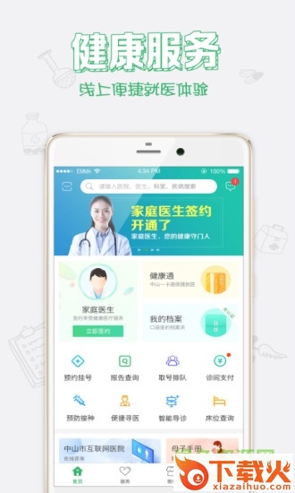 医院主页:可查看医院的介绍、开通的功能、院内导航、科室医生。
