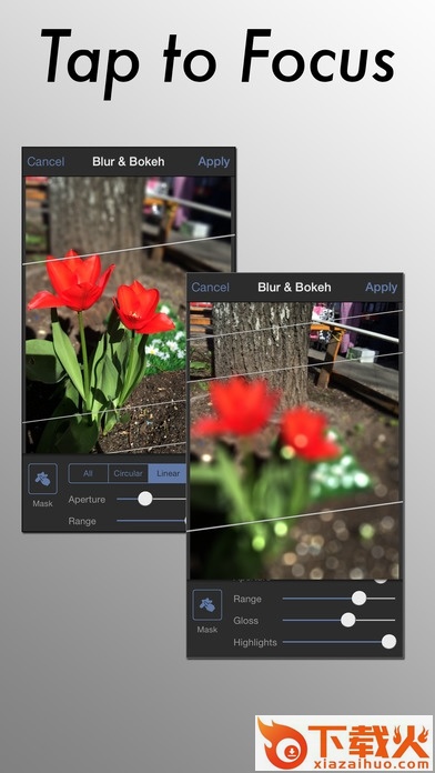 这款应用专门制作图片背景虚化效果。简单的操作带来不一样的图片效果,你可以拍照或选择图片、选择焦点区域、再点击下一步,即可完成图片景深效果!