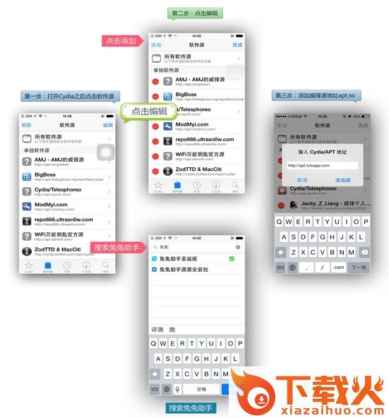 打开设备上的Cydia,找到“管理”-->“软件源”,先点击右上角“编辑”,再点击左上角“添加”,在弹出框内输入相关源地址,点击右上角“完成”,即可成功添加源。