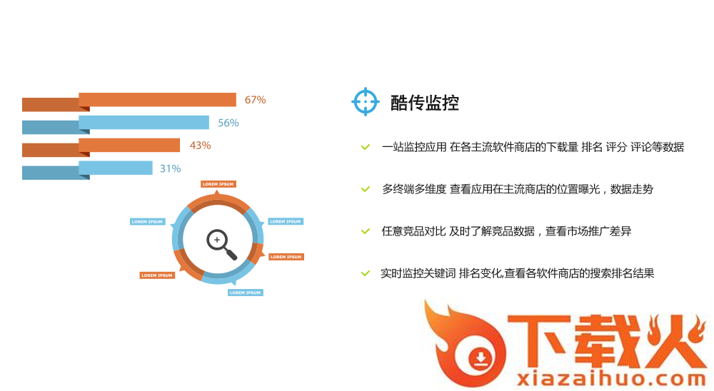 开发者可以通过酷传应用监控功能,查看应用在主流市场下载量、排名、评分评论、关键词排名等数据,还能系统地与同类竞品进行数据对比。