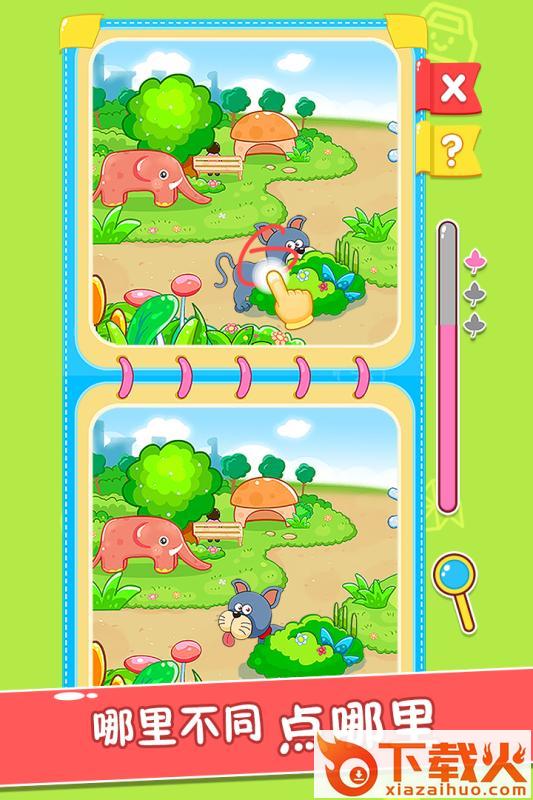宝宝玩找茬游戏是一款休闲益智的游戏,游戏精心设计不同有趣的关卡,和不同场景下的各种大自然环境,玩家需要在不同场景下进行找不同,在两幅看似性的的画中找出隐藏的不同地方,在最短的时间内找出最多不相同的地方就能完成任务,获得胜利快来体验吧等待你的挑战。