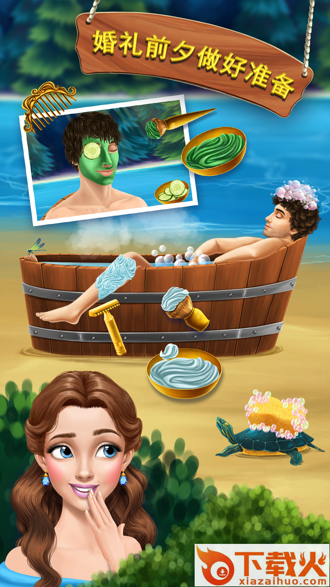 洛娜公主和王子殿下的婚礼就要开始了,快给王子殿下打扮吧。刮掉浓密的胡须,再做一个简约时尚的卷发造型,嗯~和洛娜公主真是天生一对!糟糕,忘记了打扫公主的马车了!收拾杂乱的靠垫,再给马车刷上喜庆的颜色,搭配金黄的皇室徽标,这可马虎不得。可别忘了公主最心爱的小马,洗去灰尘,露出洁白的毛发,再给马鬃和尾巴染上颜色、钉上金黄的马蹄铁,犹如童话世界的独角兽一样。神圣的婚礼殿堂上,公主和王子携手踏上爱的红地毯,洋溢着幸福快乐的微笑~