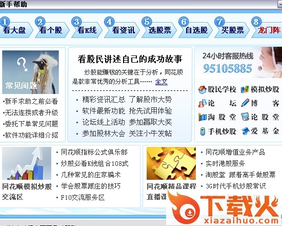 新手帮助共分7课教程,分别是:看大盘、看个股、看K线、看资讯、选股票、自选股、买股票,均配有图文教程,需要深入学习可查看相应的视频教程。