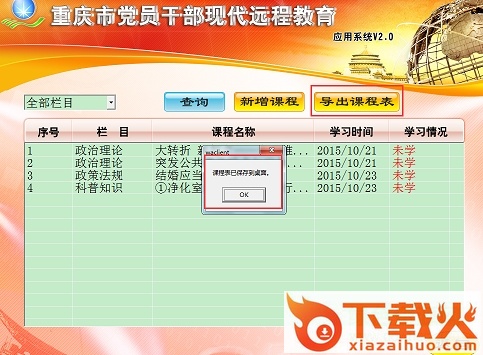 站点管理员制定好课表后可以从这里导出课程表,点击“导出课程表”,系统直接将课程表保存到桌面,点击“ok”,在桌面上可以看到 “课程表。Txt”,管理员可以直接打印该文本文件,以公告的形式张贴到公告栏,让所有党员根据课程表进行学习。