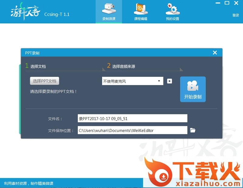 用户在录制PPT视频的时候,需要先选择相应的PPT文件,如需录制讲解声音,可使用内置麦克风或外接音频输入设备,然后根据软件操作提示进行录制。