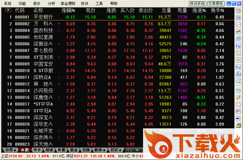 敲数字81、82、83、84、85、86、87等可分别调出上海A、B股,深圳A、B股,沪债、深债,深沪A股的综合排名。系统用9个排成方阵的小窗列出所选市场的股票的涨幅、跌幅、振幅、5分钟涨幅、5分钟跌幅、量比、委比、成交金额排名。