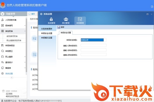 点击“系统设置”》“申报管理”》“申报安全设置”,进入申报安全设置界面,自然人税收管理系统扣缴客户端为河南省扣缴单位提供了三种申报安全类型:申报加密、信安CA、华测CA。系统默认的是“申报加密”类型,直接点击“保存”即可,密码设置功能在申报表报送时,系统会提示进行申报密码设置。