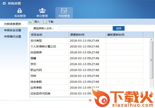 7.“申报管理”--“办税信息更新”可以从指定路径导入您新的办税信息,“申报安全设置”显示您采用的是哪种安全类型,“申报模式设置”可以修改您在系统初始化时设置的“申报模式”,当然,我们建议采用“网络申报”模式。