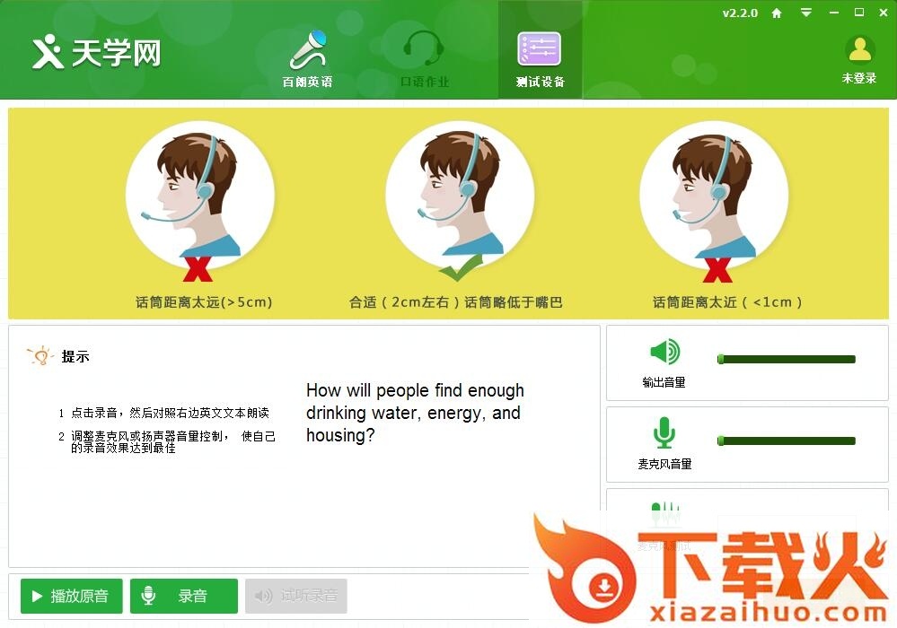 4.点击“录音”按钮,听到提示音后,对准麦克风朗读屏幕中间的句子。读完点击“结束录音”再点击“试听录音”,听听自已的声音是否能听到。