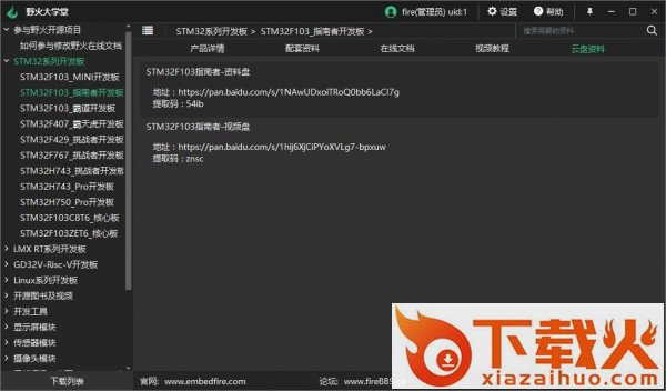 野火大学堂是一个电脑客户端,主要用来方便用户下载野火所有产品的资料,是一款集资料下载,在线文档,在线视频和资料更新推送于一体的软件,