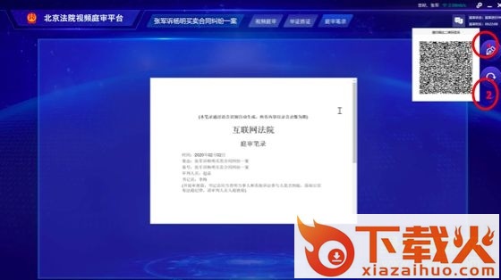 当事人可以实时查看庭审笔录,法官在庭审结束后,发起签名当事人可点击图1-14中①弹出二维码进行扫码签名。在整个庭审过程中,②可以点击“刷新”按钮,实时查看庭审笔录。