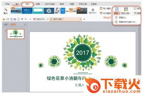 方法二:在功能区,点击“设计”-“背景”进行设置。