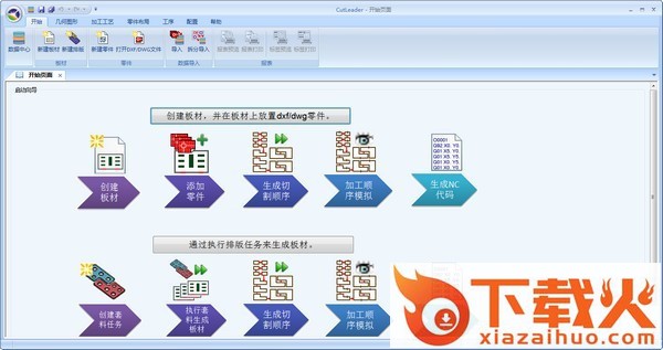 3、之后用户可查看到开始页面的启动向导,这里主要介绍CutLeader创建板材和生成板材等具体操作,例如创建板材主要的步骤可分为:创建板材-添加零件-生成切割顺序-加工顺序模拟-生成Nc代码