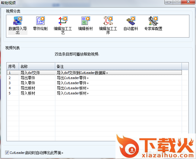 2、界面弹出第一个窗口即是—视频操作教程界面,这里详细罗列出一些基本的视频教程,包括数据导入导出、零件绘制、编辑加工工艺和编辑板材等,用户若想了解某个操作即可双击进入浏览