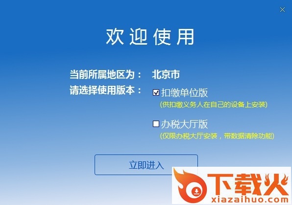 4.点击安装完成界面上的【立即体验】(或点击桌面“自然人电子税务局(扣缴端)”快捷方式),进入版本选择界面。除了在办税大厅终端上部署的客户端选择“办税大厅版”外,其他均选择默认选项,即“扣缴单位版”。