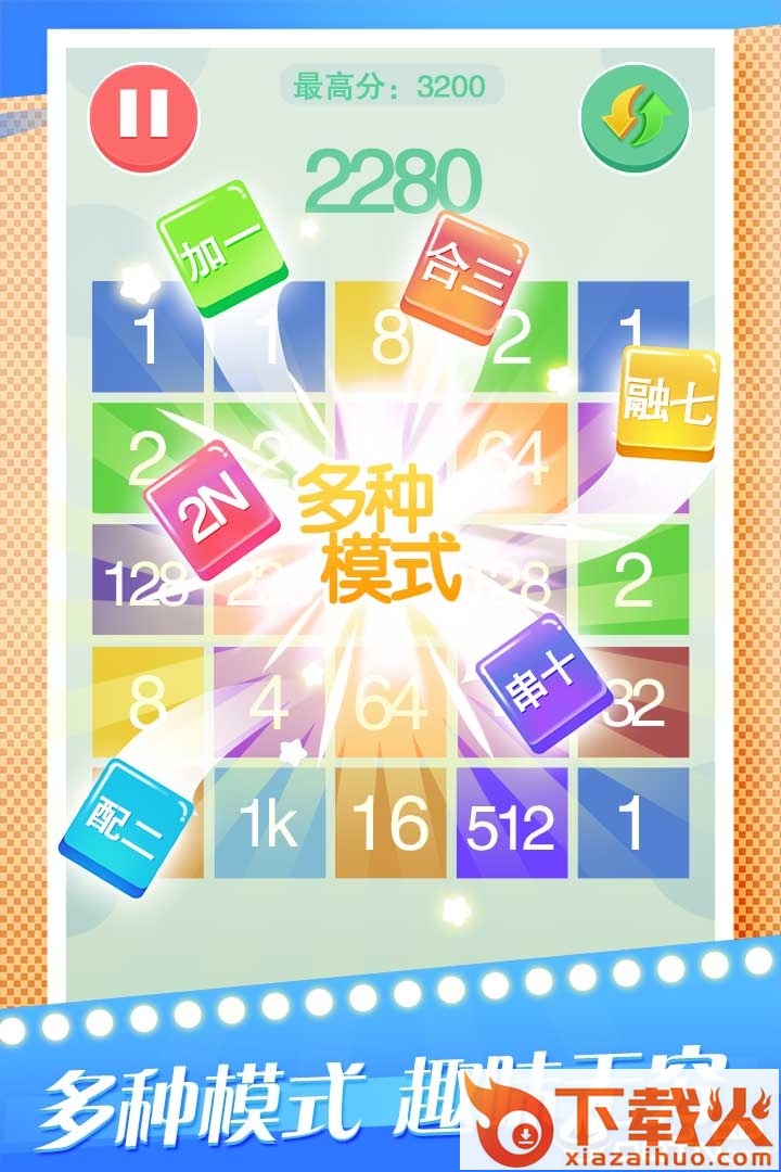 2. 游戏提供了六种模式:加一、配二,合三,融七,串十和2N,每种模式具有一种独特的玩法。