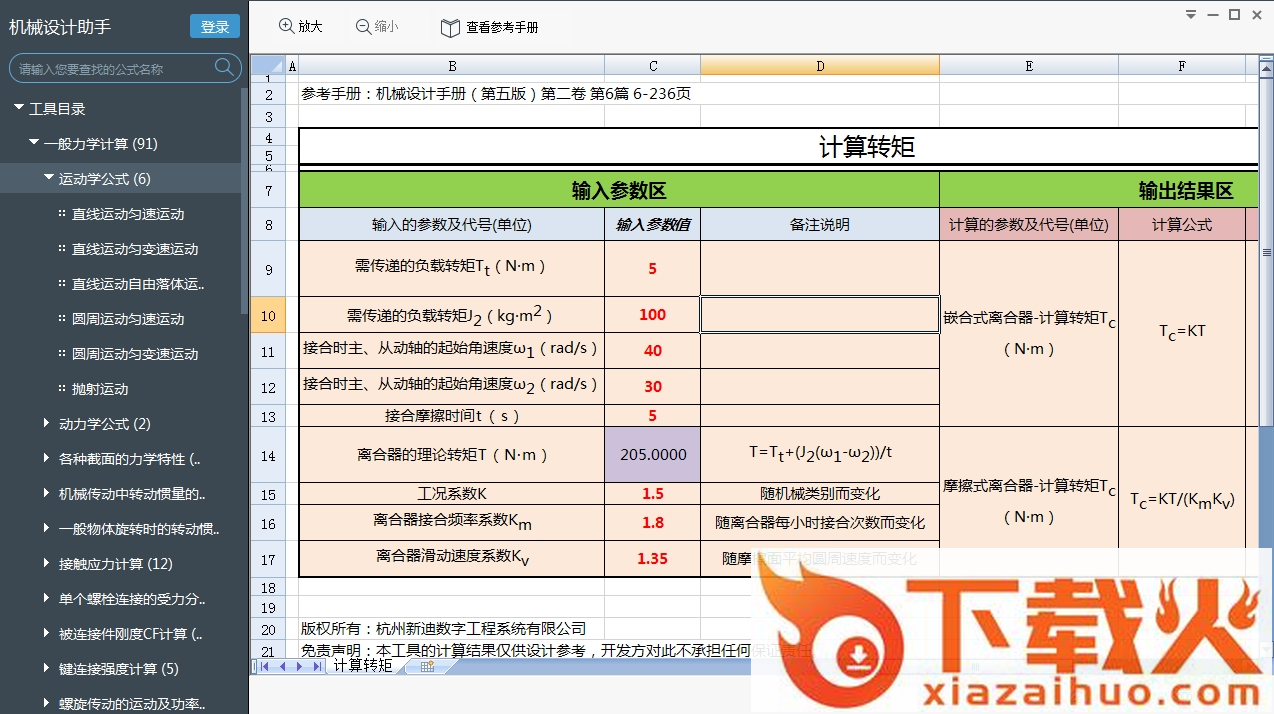 包含:一般力学计算、联轴器选用计算、离合器选用计算、轴承计算、弹簧计算、链轮传动计算、齿轮传动计算、常用电机计算、模具计算、流体力学常用计算公式以及公差查询等570个计算查询表格。