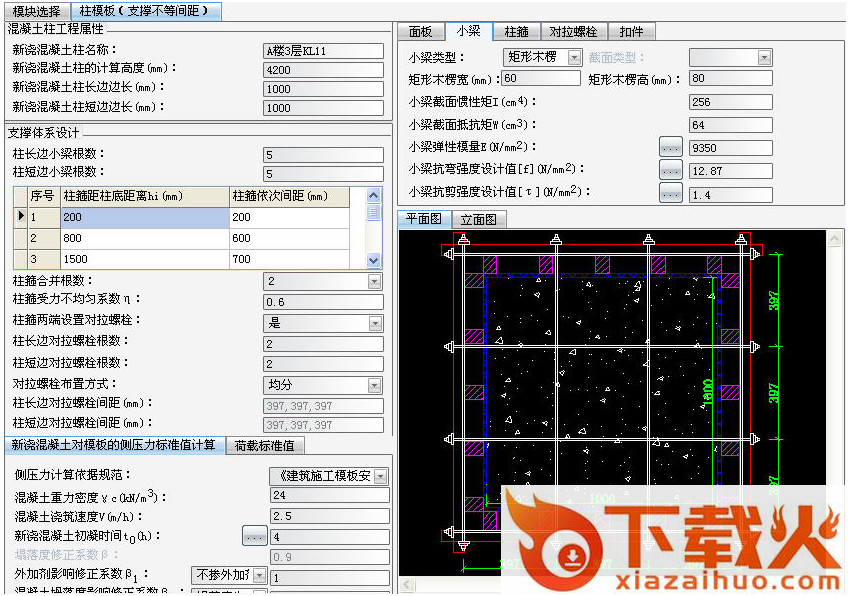 根据《组合钢模板安全技术规范》,当面板类型为组合钢模板时,可不设小梁,设小梁的做法,比较浪费材料,为此软件采取了不设小梁的做法。当面板类型为组合钢模板和木模板时,面板的计算涉及到面板的长度和宽度等参数,即按某一块面板来计算。即用户需先作分析出哪块面板受力是最不利的,如用户分析不出,可依次将不同的面板支撑参数输入软件。如3m高的柱子,采用2块1500mm长300mm宽的组合钢面板竖向叠加,假设此两块面板的悬挑长度分别为200mm和300mm,那哪块面板受力最不利?则需用户输入两次,或根据经验直接判断。