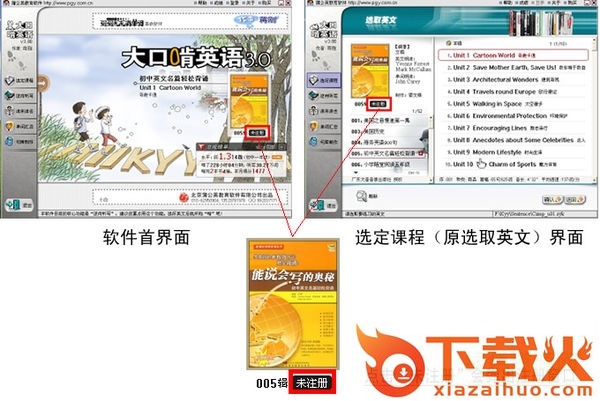 1、在软件的首界面或“选定课程”(原“选取英文”)功能中,点击下图中的“未注册”,会弹出注册窗口。