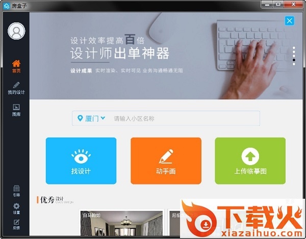1. 进入房盒子,直接在首页“优秀设计”一栏中下拉,浏览并寻找心仪设计。