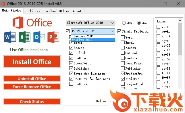 2.选择安装office2019(这里提供了office2013、office2016、office2019三个版本的选择),旁边选择安装的位数(x86、x64),然后选择Proplus 2019