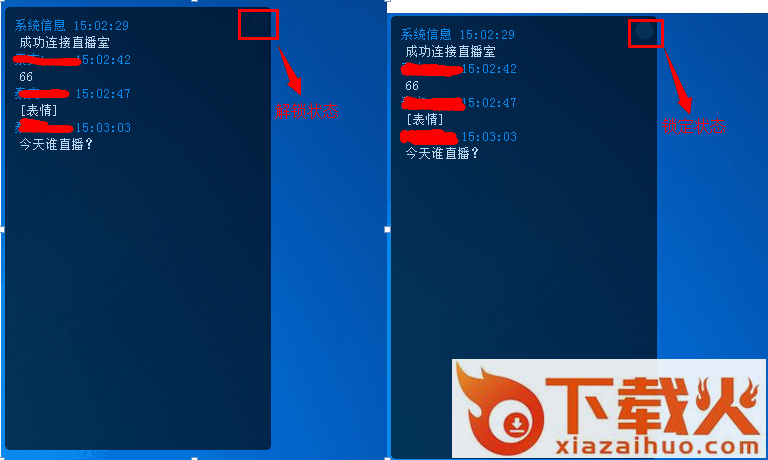 连接后,弹出弹幕框,系统消息提示是否成功连接聊天室。弹幕显示用户名、时间、以及内容。右上角为锁定解锁/按钮,可以再游戏中单击按钮进行切换